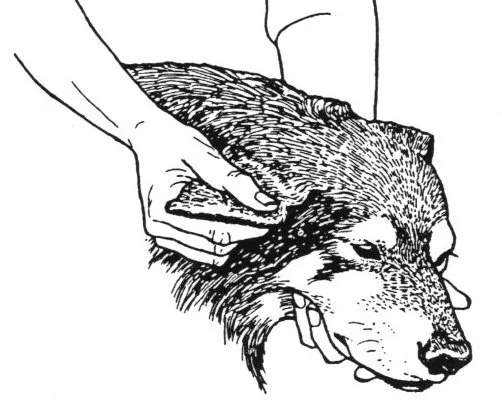 When we’re supporting the chin with one of our hands, the other one will do some circular TTouches around the muzzle. We might want to use the tips of our fingers, with the first segment or with the first two segments of our fingers, and these would respectively be the Raccoon TTouch, the Clouded Leopard TTouch and the Lying Leopard TTouch. (in the Tellington TTouch every touch has the name of an animal)