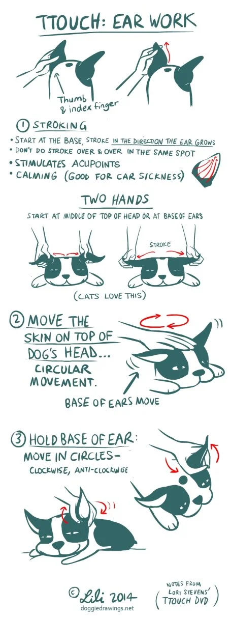 An other way to work the ears is to grab them gently one at a time, at the base, and moving them holding them, always in a circle and a quarter pattern motion, then adding a pause and repeat, both clockwise and anti clockwise motions are possible here.